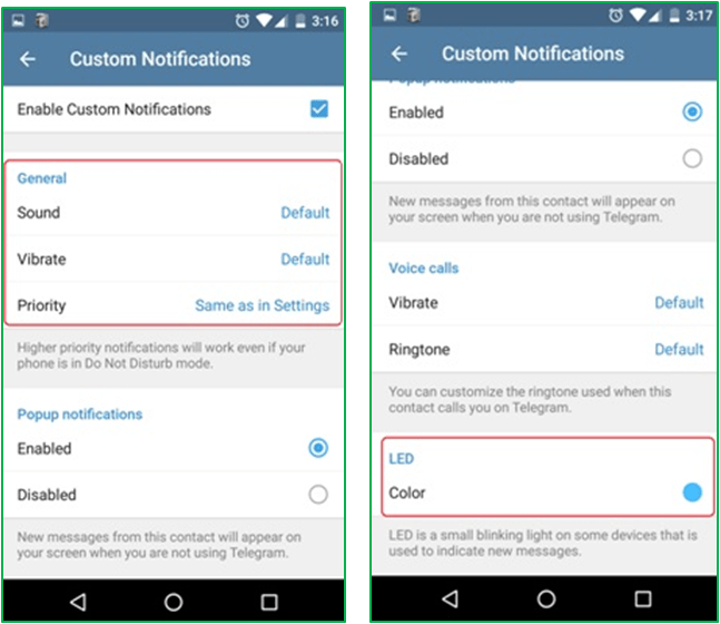If you want to distinguish between your close friends and acquaintances, Telegram Messenger allows you to assign distinct LED colour tags as well as notification sounds to individual users. The same phenomenon holds true for groups. So, the next time you see an LED notification light or hear a personalised preset sound you would know it is from someone close!