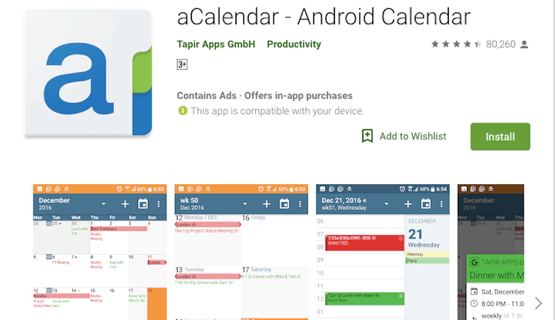 The aCalendar app provides an intuitive navigational interface with a smooth transition between day, week, and month view. Besides, it also includes customization features, tasks, themes, Google Calendar support, and even special stuff like moon phases and holidays.