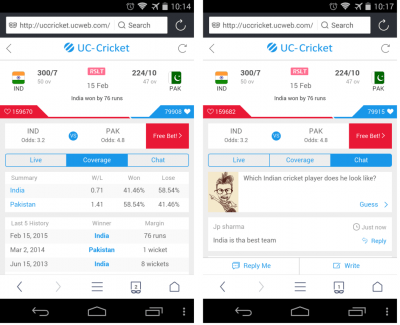 “During the 2014 IPL, 1 million users logged onto UC Browser for cricket information. We are expecting that number to increase significantly during the ongoing cricket tournament,” said Abhishek Sharma, Director of Marketing Communications at UCWeb India.
